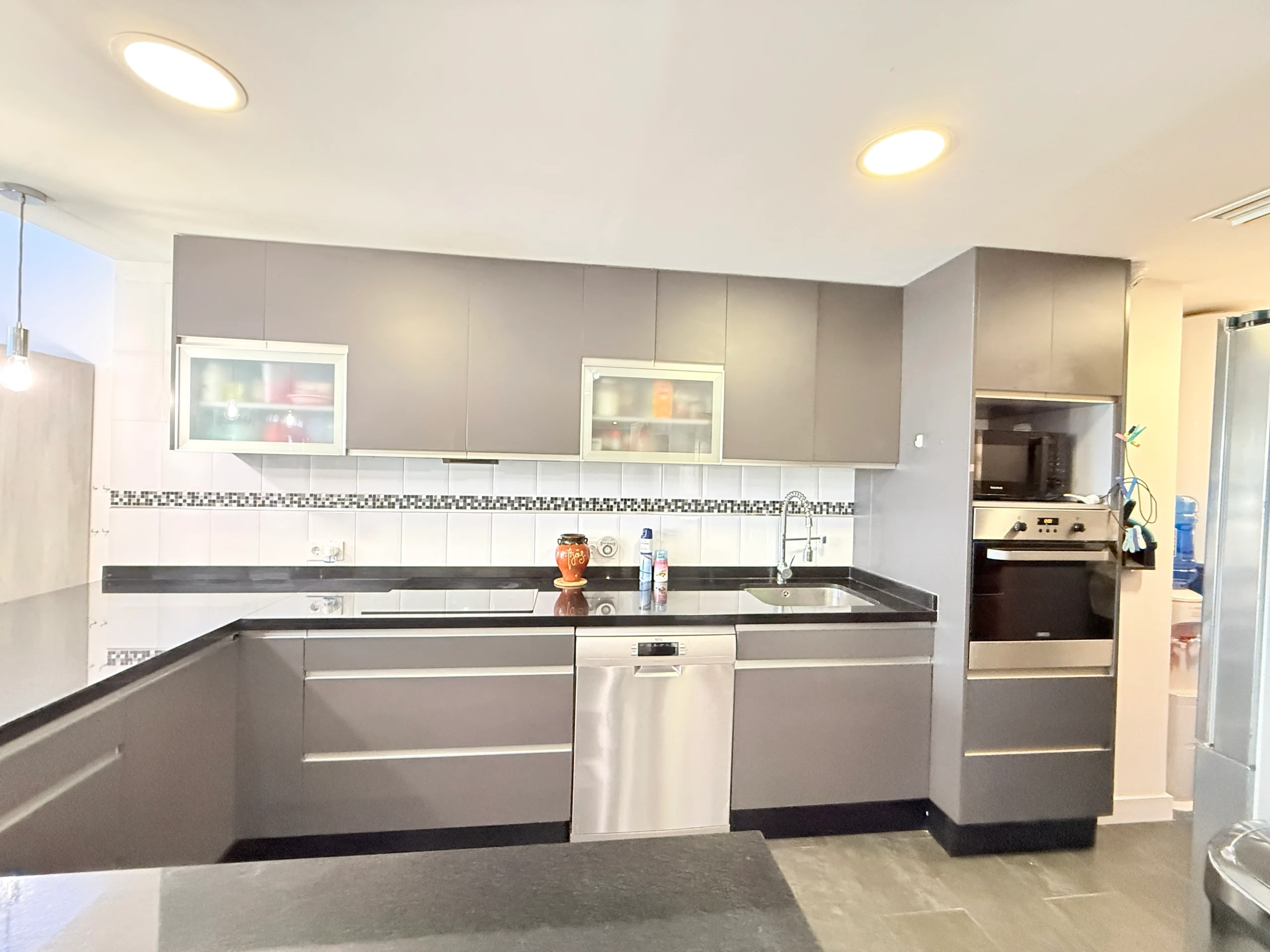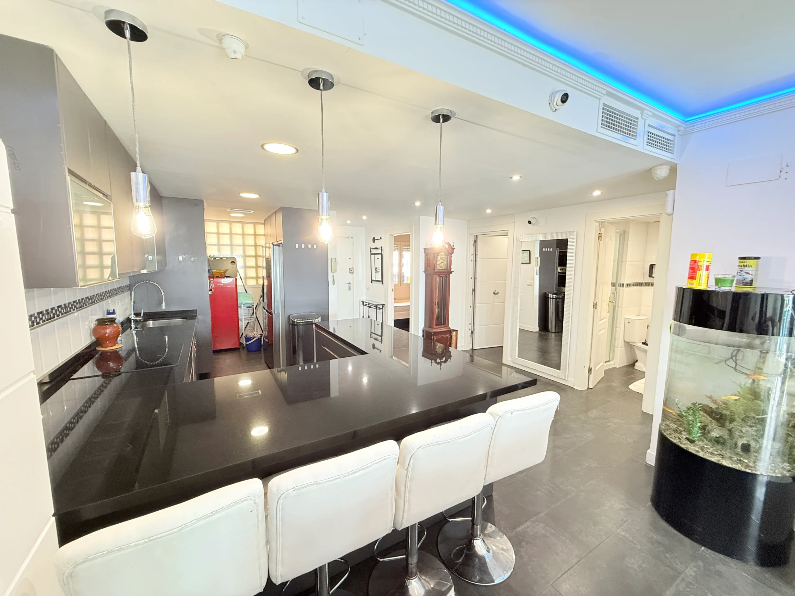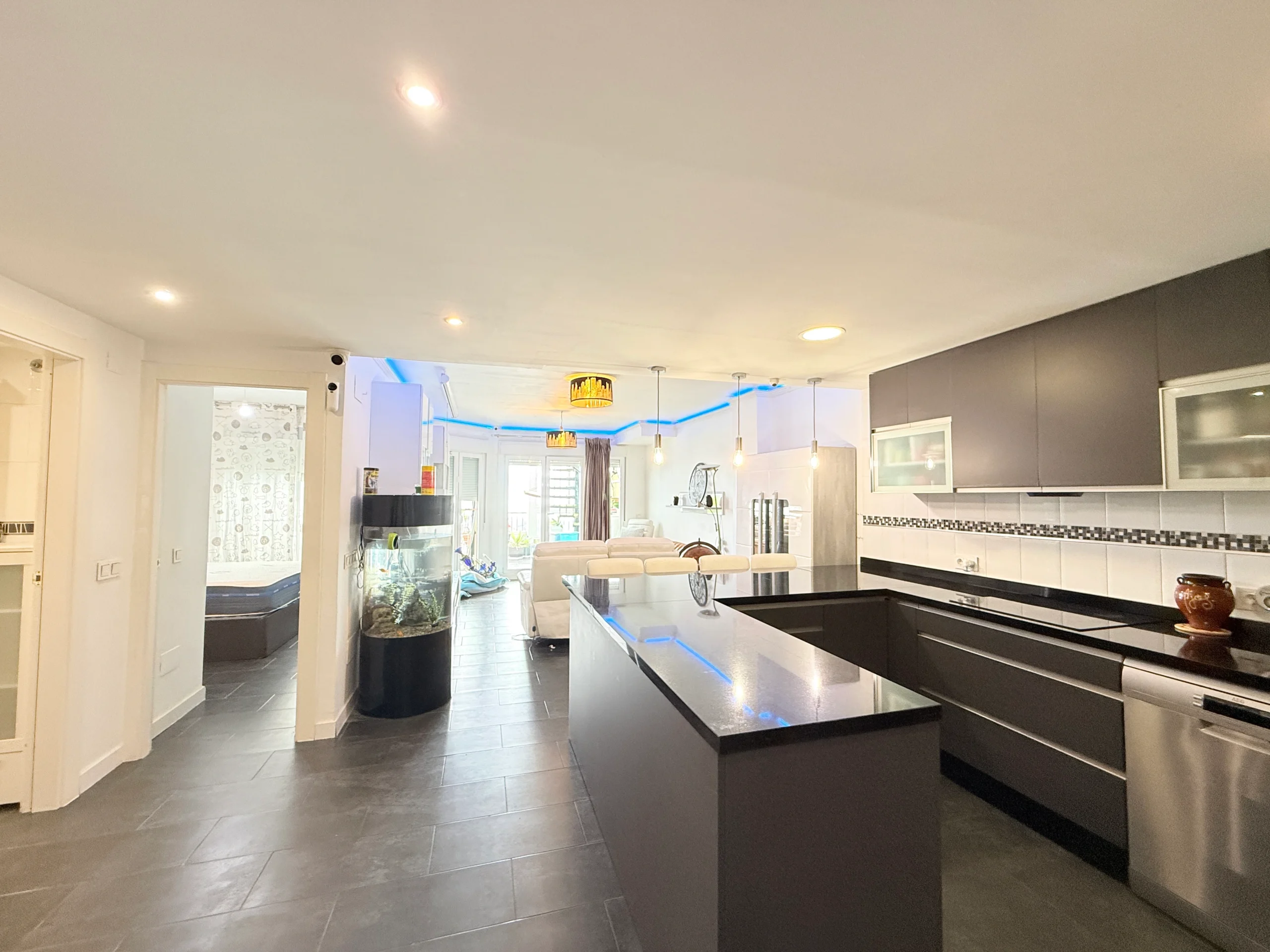 Salón y Cocina: Amplio salón integrado a una cocina moderna totalmente equipada (incluye dos neveras, horno, microondas y electrodomésticos de última generación).